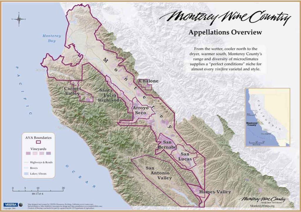 In Monterey county however wine makers have found a perfect little niche where both of these varieties can ripen reliably. The Monterey region enjoys long warm days and intense sunshine which allows the fruit to ripen well. The cool night time temperatures then help to maintain acidity and thus a balanced wine.